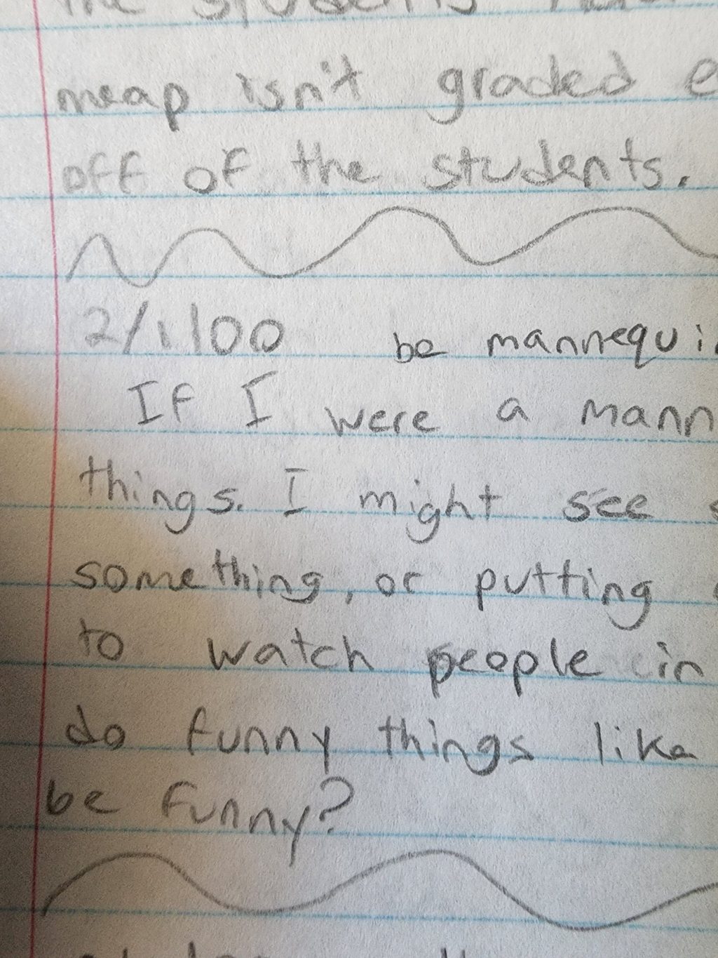 If I were a mannequin I might see a lot of weird things. I might see someone shoplifting, or hiding something, or putting on makeup. It would be weird to watch people in a store all day. They might do funny things like dance or sing. Wouldn’t that be funny?