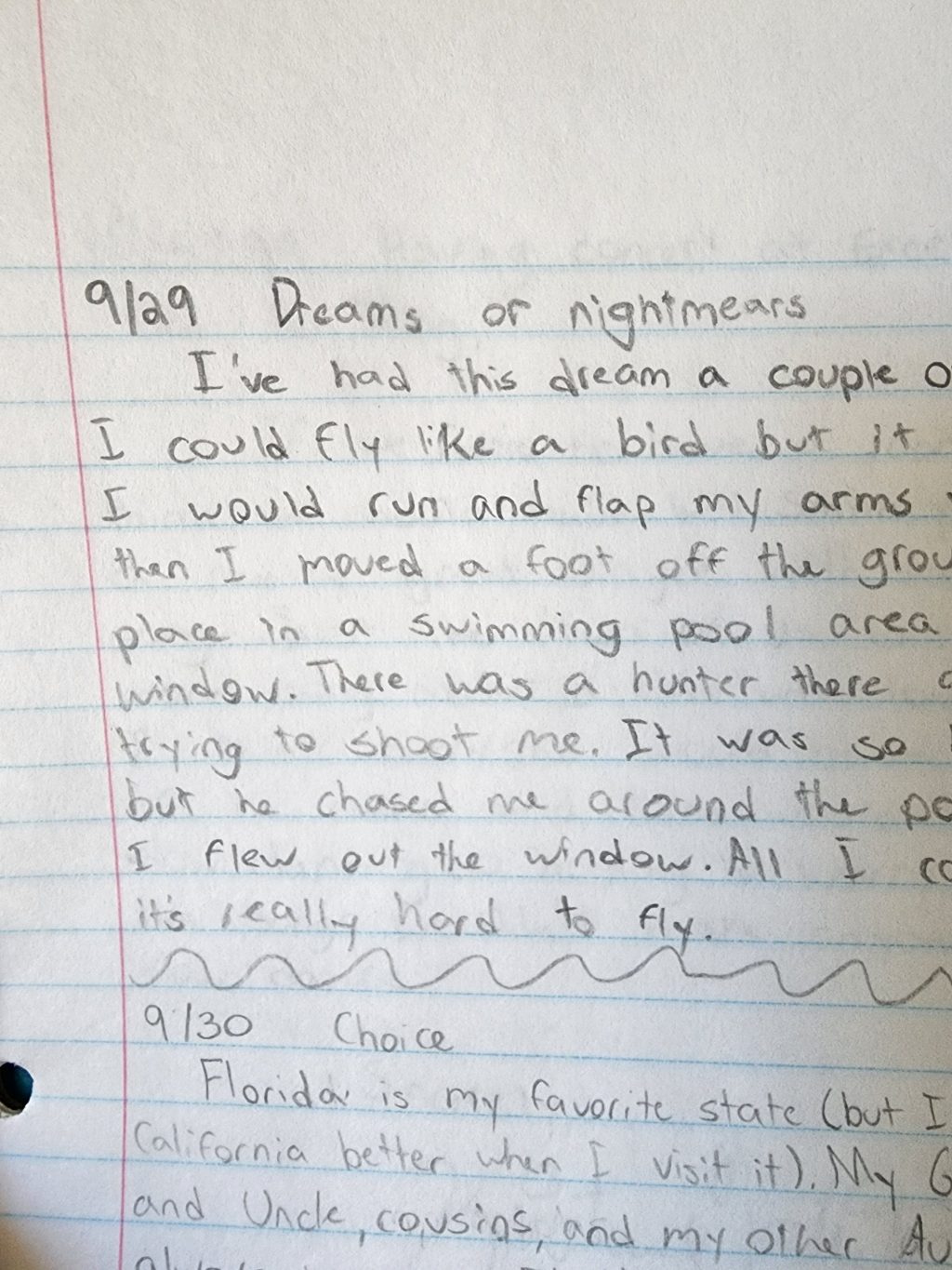 I’ve had this dream a couple times where I could fly like a bird but it was very hard. I would run and flap my arms very rapidly and then I moved a foot off the ground. It took place in a swimming pool area with one open window. There was a hunter there and he was trying to shoot me. It was so hard to fly but he chased me around the pool and finally I flew out the window. All I can say is that it’s really hard to fly.
