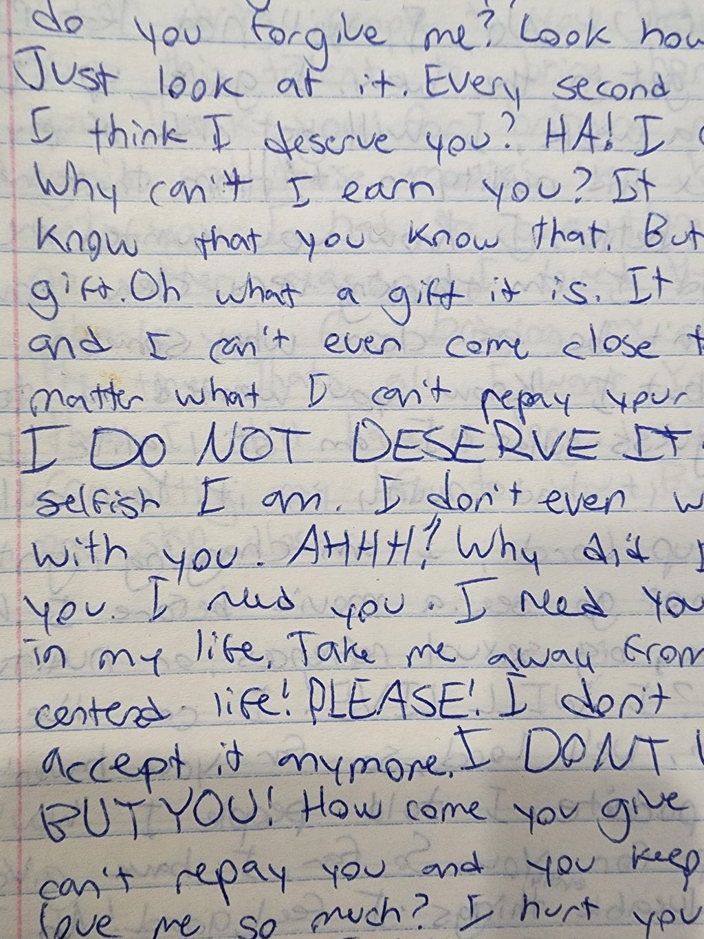 God, why do you even bother with me? Look at every wonderful thing you have put in my life. redacted, redacted, redacted, redacted, redacted, redacted, redacted. I don’t deserve any of it. Why are you giving me all of these things? I deserve nothing! I am so selfish, and I thought before I’m good, I deserve these things. Why did you give them to me? You have put such wonderful people in my life and I take them for granted. Why, no matter how much I same, do you forgive me? Look how much I hurt you. Just look at it. Every second I take you for granted. I think I deserve you? Haha! I cannot earn you! Why can’t I earn you? It would be easier. I know that you know that. But you gave me a gift. Oh what a gift it is. It is such a great guy and I can’t even come close to repaying you. No matter what I can’t repay your gift card. Why? I DO NOT DESERVE IT! Just look how selfish I am. I don’t even want to spend time with you.! Why did I do that? I love you. I need you. I need you to be everything in my life. Take me away from my selfish, self-centered life! Please! I don’t want it. I will not accept it anymore. I DON’T WANT ANYTHING BUT YOU! How come you give me more? I already can’t repay you and you keep giving. Why do you love me so much? I hurt you. I hurt you a hundred times over today. I hurt you so much. I am selfish and I still go on thinking that my life is my own? haha! I am so foolish! I wouldn’t want to be in control of my life even if I was. I would screw everything up. I cannot do anything without your help Lord. I DON’T WANT TO BE SO SELFISH! I only want you, I ONLY WANT YOU. I can’t believe that I let stupid things take me away from you, God, I almost failed you again. You texted me. Told me to break those movies. You showed me which ones. I did it. Help me in explaining it to others, Lord, all I know is that you wanted me to do it. It wasn’t my own desire to break them. I AM STILL FAILING YOU~ No, I will not let my selfish desires get in the way. I gave up CDs, money, TV for a week. I will get rid of my movies with sex and nudity in it! Hmmm, that was for you. I feel better. I know you wanted me to do that and I am thinking very clear now. I know I won’t be as clear when someone questions me, but I know you wanted me to do that. Hey, guess what? I am still alive. I loved T2 but it had nudity in it. You called me to give it up. Lord, I am changing right now. I will not go see a movie before I know if it has sex, big sexual references, or nudity. And guess what? I WILL LIVE! I can live a life of freedom. Well Lord, so far you haven’t made me a hypocrite. I have I told people I would give up anything for you. So far I have given up my most valuable Earthly things. I feel good! No, I FEEL REALLY GOOD!!! I can do anything for you, with your help of course! Wow, who would think I would give up music and bad movies. I never saw this coming. But I am happy to give them up, so happy! Help me to keep my promise on music and movies. Here, I will lay down my rules for movies. I will always have to go online to reil.com and see the sex and nudity content. From that I will decide if I can see that movie or not. I will always check beforehand, because not even I know everything in the movie! But Lord, you have given me a talent and passion. I can be the best director out there in through my movies I can bring people to you. Help me and always using this talent to bring honor and glory to you. Thank you for bringing me closer to you again in those movies were hurting my walk with you. I had to give them up and if for no other reason, I love them too much. Lord, thank you for bringing me closer to you all the time. That’s all I want. You showed me today that I still have a long ways to go and totally committed my life to you, but you brought me one step closer.