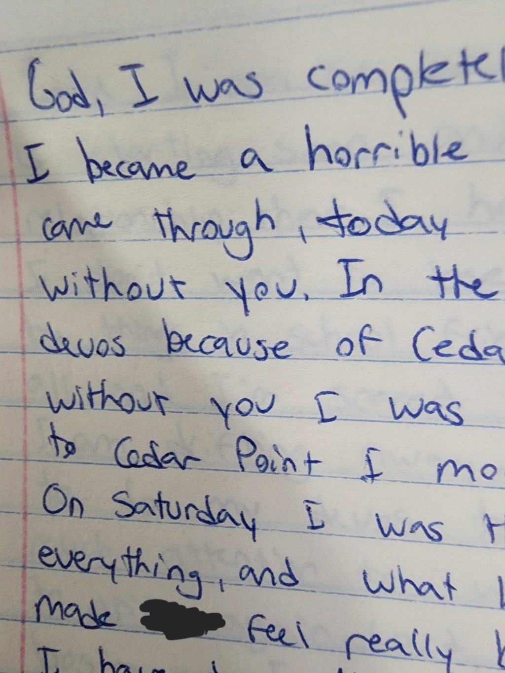 God, I was completely horrible today, and this weekend. I became a horrible person, like the worst part of myself came through today mostly. But look where I am without you. In the past three days I didn’t do my devos because of Cedar Point. And look, because I went without you I was absolutely horrible. On the way up to Cedar Point I mocked redacted a bit I’m sure. But on Saturday I was the worst. I mocked redacted about everything, and what kind of friend does that. I made them feel really bad, and that’s just the worst thing I have done. Also, I love listening to that music. I loved it so much. But I do not want to love it. I want to hate it for you. And, I gave it up and by my not being strong in my decision to give up music affected redacted. They knew I gave it up and I just showed them how I wasn’t following through in the decision. Today, I was rude, nasty and horrible to redacted over the internet and work. I don’t want to be like this Lord. I feel horrible. I need your help so much. I can’t go without you, so please may your hand be with me!