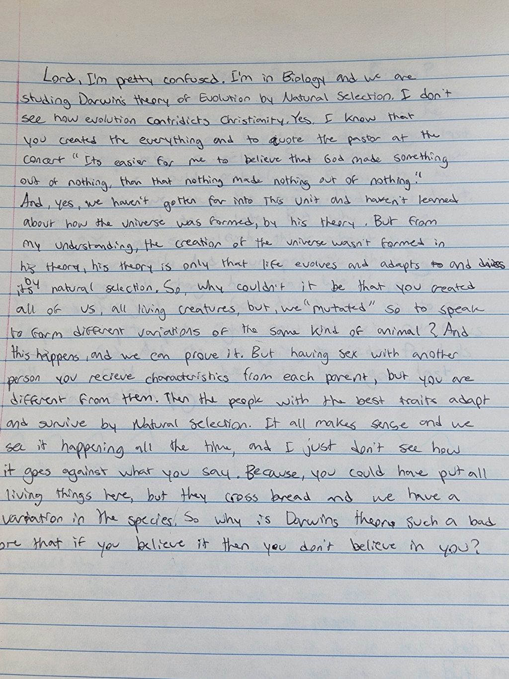 Lord, I’m pretty confused. I’m in biology and we are studying Darwin’s theory of Evolution by natural selection. I don’t see how Evolution contradicts Christianity. Yes, I know that you created everything and to quote the pastor at the concert “ it’s easier for me to believe that God made something out of nothing then that nothing made nothing out of nothing”. and, yes, we haven’t gotten far into this unit and haven’t learned about how the universe was formed, by his theory. But from my understanding, the creation of the universe wasn’t formed in his theory, his theory is only that life evolves and adapts and divides by natural selection. So, why couldn’t it be that you created all of us, all living creatures, but we mutated so to speak to form different variations of the same kind of animal? And this happens, and we can prove it. But having sex with another person you receive characteristics from each parent, but you are different from them. Then the people with the best traits adapt and survive by natural selection. It all makes sense and we see it happening all the time, and I just don’t see how it goes against what you say. Because, you could have put all living things here, but they cross breed and we have a variation in the species. So why is Darwin’s theory such a bad one that if you believe it then you don’t believe in you?