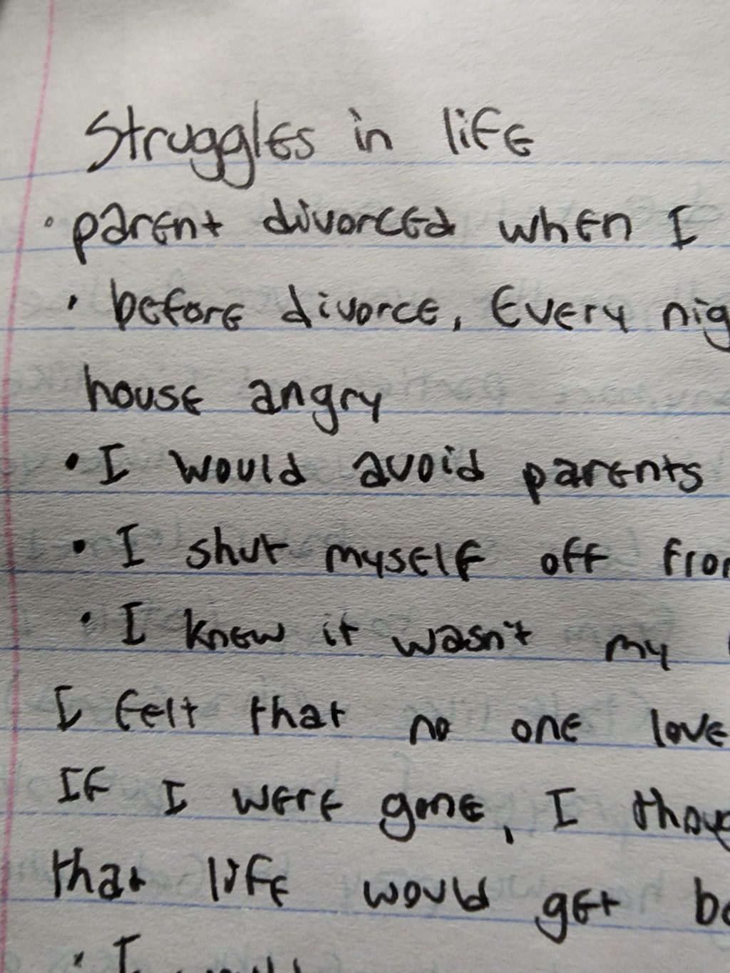 - I knew it wasn’t my fault my parents were fighting, but I felt that no one loved me and that no one would care if I were gone, I thought about killing myself but knew that life would get better