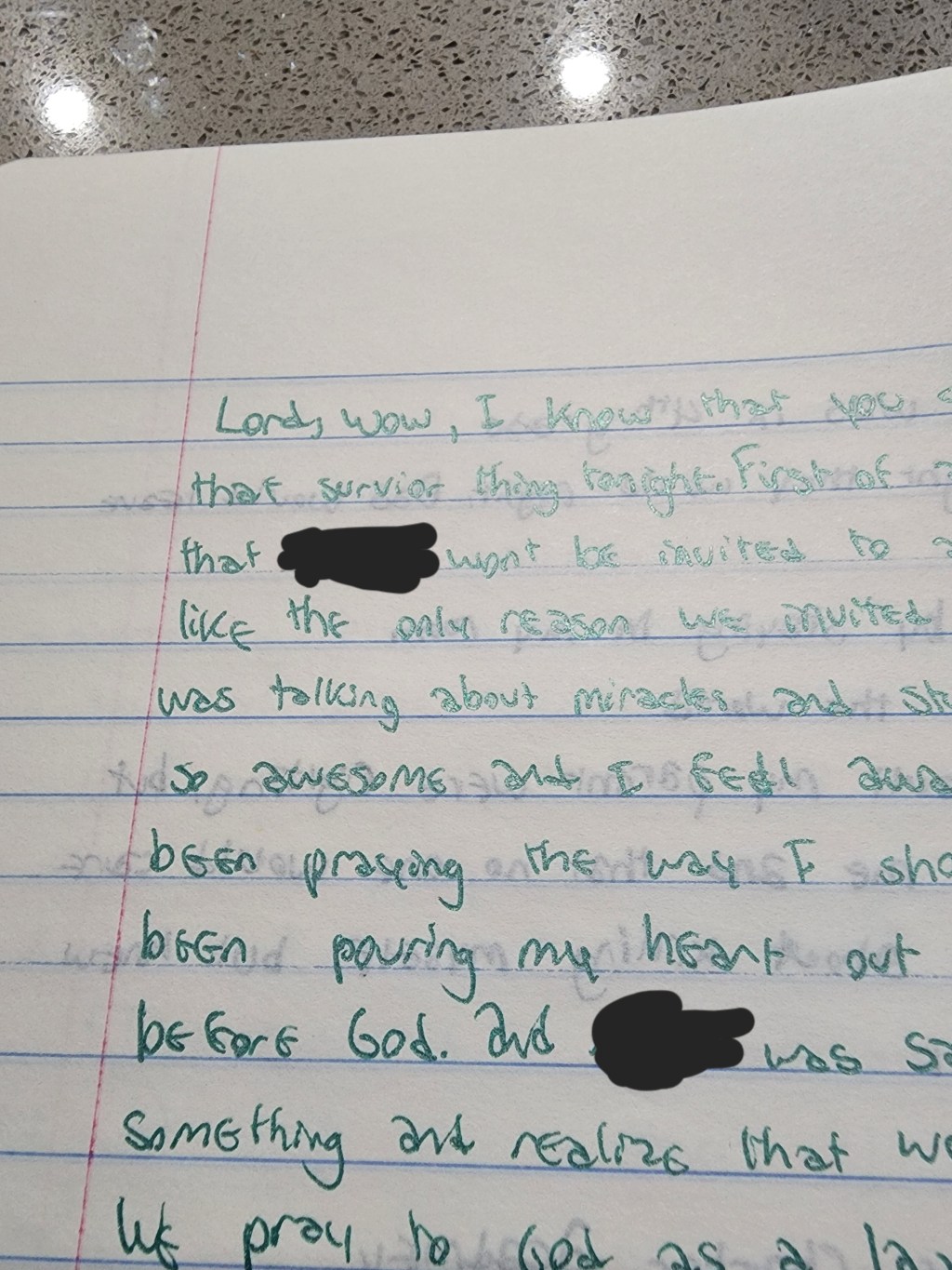 Lord, wow, I know that you definitely wanted me to go to that Survivor thing tonight. First of all, on the way over redacted tells me that redacted won’t be invited to any more parties, and I’m like why? They’re like the only reason we invited them was because we like you. Then redacted was talking about miracles and stuff. Let’s see what I learned. God, you’re so awesome and I fell away from you today. Lately, I haven’t been praying the way I should (talk like with a friend). I haven’t been pouring my heart into prayer. I have put other things before God. And redacted was saying how we pray to God when we need something and realize that we can’t get out of the mess on our own. We pray to God as a last-minute type thing. I haven’t been getting as excited about prayer lately. It seems to have become a routine, not a relationship. I have been lazy and not done the Prayer of Jabez thing. God brought me to that place for a reason. I was thinking that in my mind well redacted was talking about miracles. Then redacted said it out loud, again if you confirmed my feelings. You said God brought us here for a reason. Every one of us, right after I got done thinking it. Then what really hit me was that mine thing where you created man, then man did all the things like drugs, sex etc. and then when sin stabbed us in the back you came and took the beating for us. It was really cool. But after the whole thing was over something extremely cool happened. This stranger came up to me and said they saw me dancing up front and said I had the most energy of anyone up there and said something really cool like you’re the kind of person who is fun and succeeds and everything you do, something like that. The point is I asked God to help me dance in a way that would help someone there. Then I dismissed the thought, but after a strange person came up to me. God worked miracles right in the middle of prayer, just like redacted said happened to him.