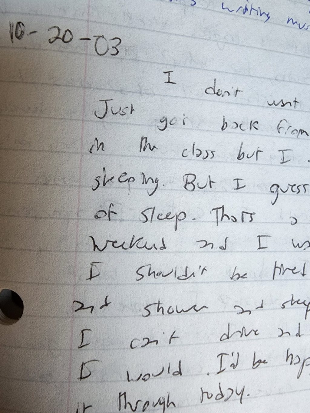 I don’t want to write in the journal. I’m kind of tired. Got back from TEC (Teens Encounter Christ). I don’t know what’s going on in the class but I don’t feel like asking. I feel like sleeping. But I’m guess I’m not that tired. I got 9 hours of sleep. That’s a ton. It’s almost what I got this weekend and I wasn’t tired during the weekend, so I shouldn’t be tired now. Still, I can’t wait to go home and shower and sleep. I would go shower at lunch, but I can’t drive and I probably wouldn’t come back. Oh, I would. I’d be happy with just the shower. Help me make it through today.