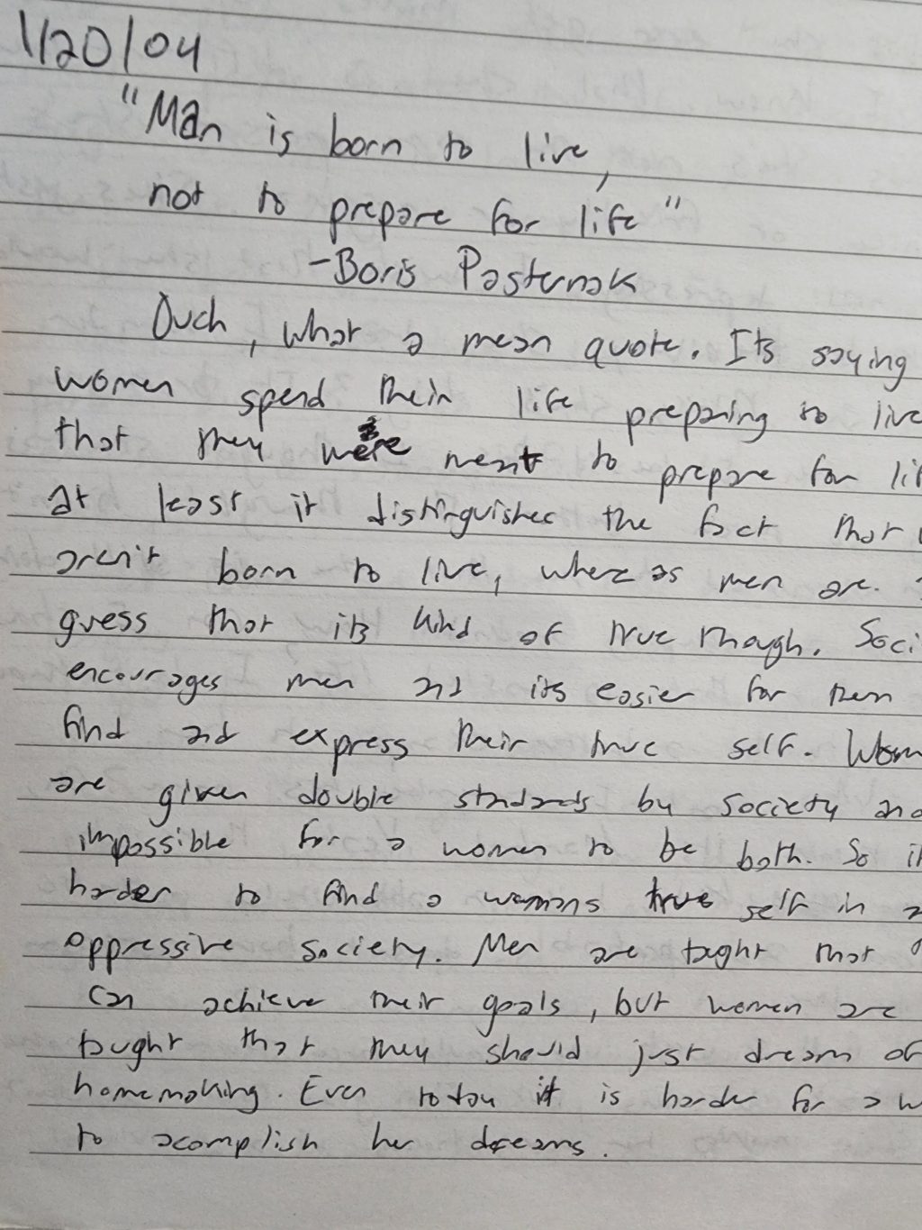 Ouch, what a mean quote. It’s saying that women spend their life preparing to live. Or that they were meant to prepare for life. Or at least it distinguishes the fact that women aren’t born to live, where as men are. I guess that it’s kind of true though. Society encourages men and it’s easier for them to find and express their true self. Women are given double standards by society and it’s impossible for a woman to be both. So it’s harder to find a woman’s true self in an oppressive society. Men are taught that they can achieve their goals, but women are taught that they should just dream of home making. Even today it is harder for a woman to accomplish your dreams.