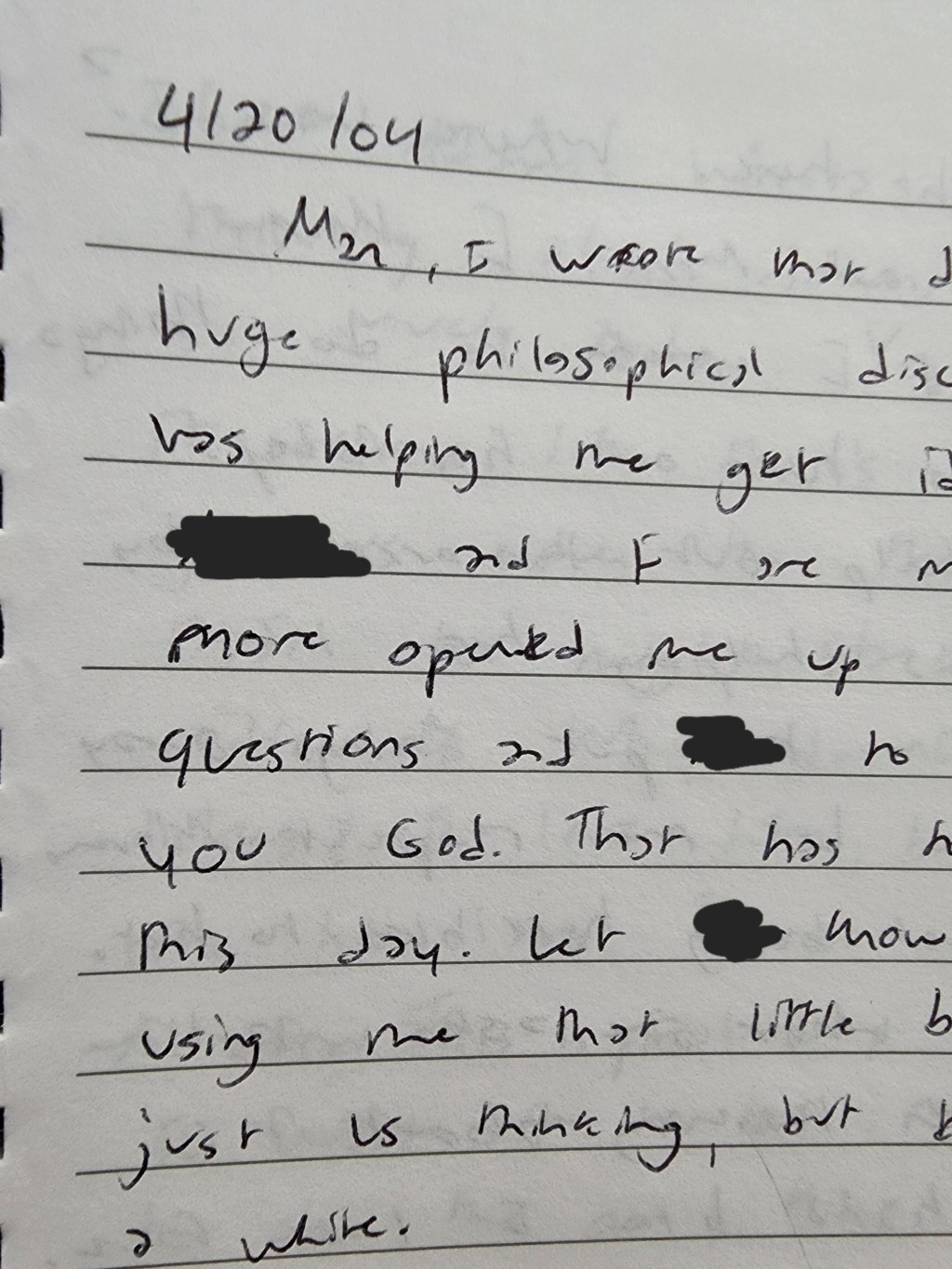 Man, I wrote that date hours ago. I had a huge philosophical discussion about God with redacted. They were helping me get ideas for the short film redacted and I are making this weekend. It opened me up to new philosophical questions and then to more insights about you God. That has to be the best part of this day. Let them know you more. Thanks for using me that little bit. It was nothing much, just us thinking, but best time I’ve had in a while.