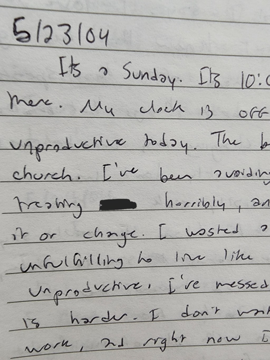 It’s a Sunday. It’s 10:08 or somewhere around there. My clock is off. I’ve been lazy and unproductive today. The best thing I did was go to church. I’ve been avoiding you God because I’ve been treating redacted horribly, and haven’t wanted to admit it or change. I wasted a lot of the day. It’s very unfulfilling to live like this, to be rude and unproductive. I’ve messed up again, and my heart is harder. I don’t want to change because it’s work, and right now I’m lazy. I want to run from my rudeness, get out of here, and avoid confronting it. I want to leave redacted. But of course I don’t. I want to live for you. You are life. So I’ll stop avoiding you. I love you. Will you change me?