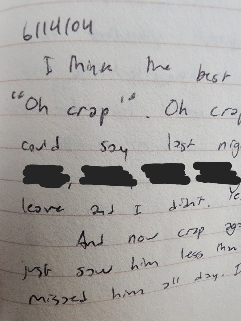 I think the best way to start this entry is “Oh crap”. Oh crap is right. That’s all I could say last night after hanging out with redacted, redacted, redacted, redacted, redacted, redacted. You told me to leave and I didn’t. Yeah… Crap. I messed up.