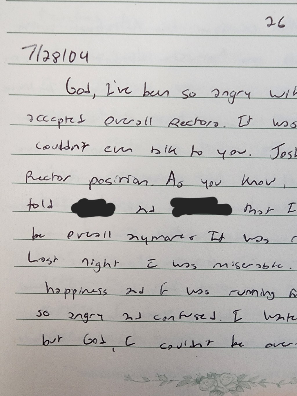 God, I’ve been so angry with you since I accepted overall rectora. It wasn’t working out. I couldn’t even talk to you. Redacted accepted the Rector position. As you know, I just went and told redacted and redacted that I wasn’t going to be overall anymore. It was really killing me. Last night, I was miserable. I couldn’t find happiness and I was running from you. I was so angry and confused. I wanted to do your will, my God, I couldn’t be over all and be happy, especially without redacted. I couldn’t do it. God I did what was right. It was right to tell them that I’m not doing it. I’m happy right now and I’m not angry at you. I was so angry.
