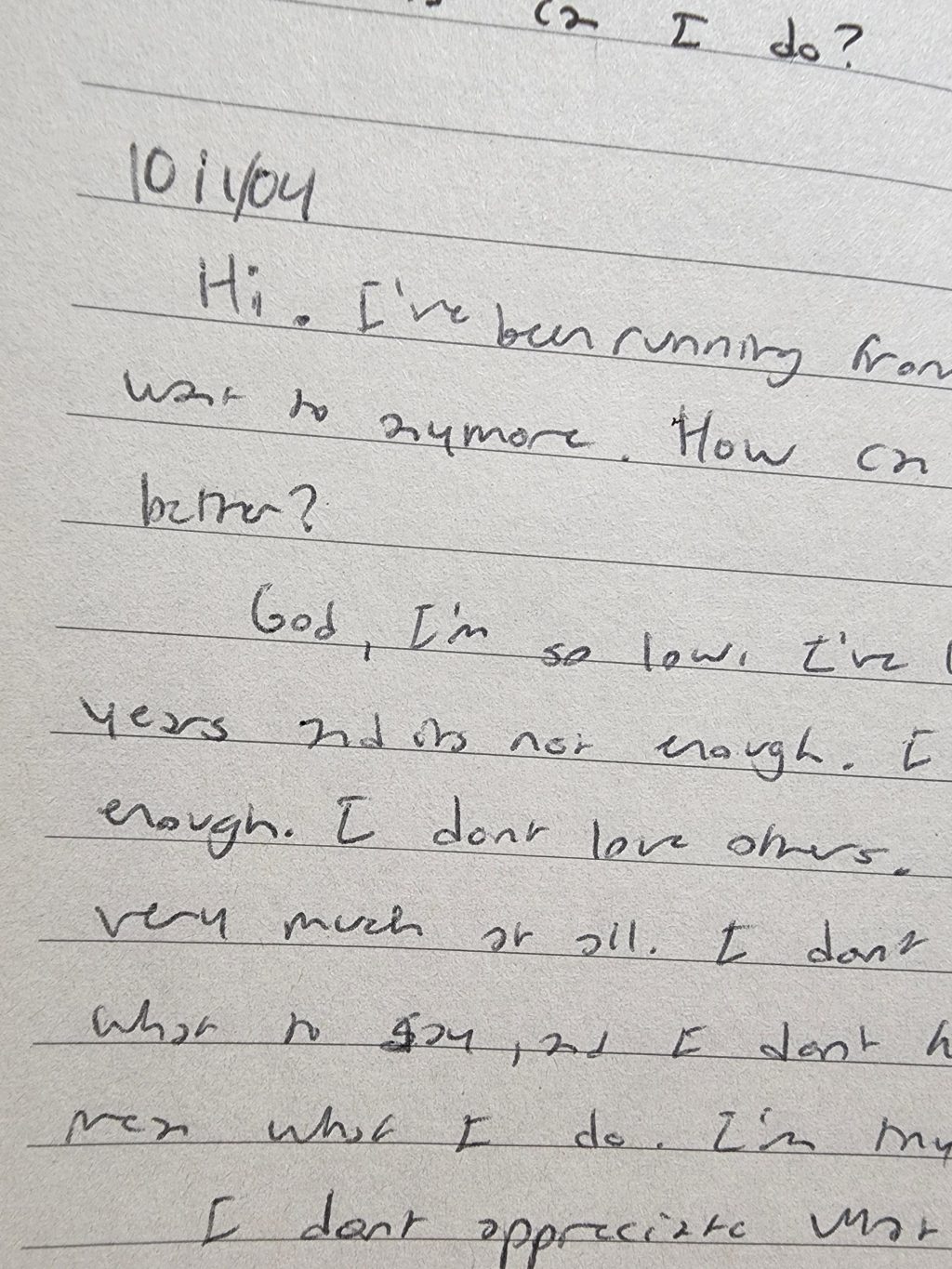 God, I’m so low. I’ve loved you for three years and it’s not enough. I don’t love you enough. I don’t love others. I don’t know very much at all. I don’t even know what to say, and I don’t know if I mean what I do. I’m trying.