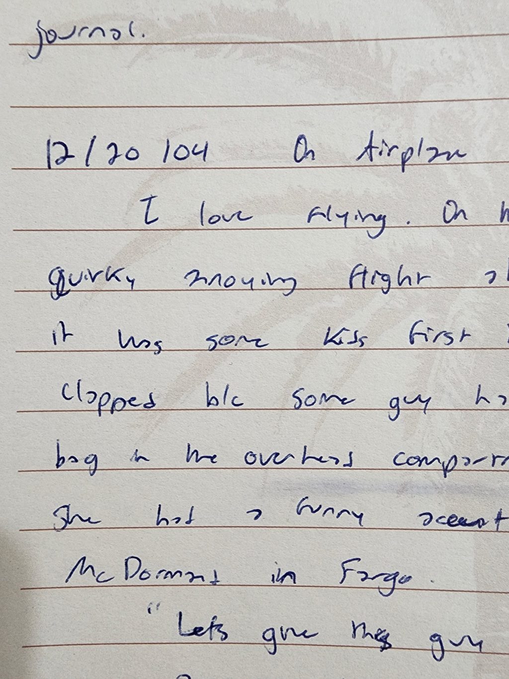 I love flying. On the first flight we got a quirky annoying flight attendant. She made us clap because it was some kids’ first time on the plane. We also collapsed because some guy had arms long enough to reach his bag in the overhead compartment without leaving his seat. She had a funny accent and talked like Frances McDormand in Fargo.
